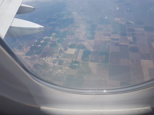On Friday, we headed off early in the morning to the airport for the return flight to New York. Debbie photographed some of the fields below that are irrigated by rotating booms that create distinctive green circles in the otherwise rather barren landscape: