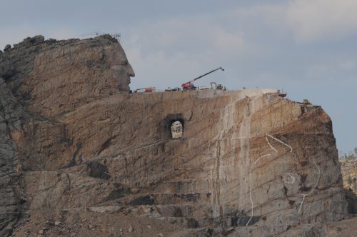 Once in South Dakota we headed further north and visited the Crazy Horse mountain. This is a mountain that is being carved into a monument to Crazy Horse. It was started by the sculptors who helped with Mount Rushmore. If you look closely you can see the profile of his head, and the crane etc are on what will be his arm (with a white finger pointing horizontally) and below that they have drawn the outline of the horse’s head in white on the rock face. Clearly a work in progress, but will be impressive when completed.
